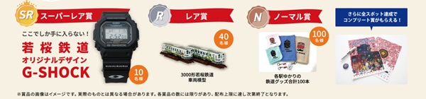 デジタルスタンプは、出てくる確率が違うノーマル・レア・スーパーレアに分かれた全42種類あり、それぞれがランダムに出現。同じレア度のスタンプが横一列に並ぶと賞品がもらえる仕掛けとなっている。賞品は、今年の若桜線開業95周年を記念し、若桜鉄道オリジナルデザインの“G-SHOCK”を目玉に、若桜鉄道さくら号の鉄道コレクションや、各駅ゆかりのある賞品が準備されている。