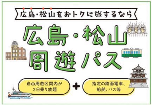 第1弾は、広島城天守閣の観覧券と広島市内・松山市内の指定の鉄道・船舶・バス等がセットになった「広島・松山周遊パス」を発売する。指定の鉄道・バス等が3日間乗り放題(航路、観光施設は利用回数に制限あり)で、観光施設で使える割引クーポンもセットになっている。