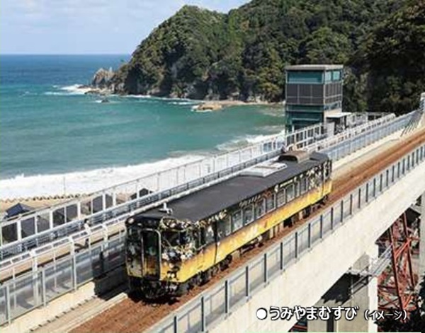その後、鳥取駅から貸切運行の「うみやまむすび」に乗車し、餘部駅に向かう。「うみやまむすび」は、人の心も温かい糸で結ばれることをイメージして列車で過ごすひと時が「旅の宝もの」になってほしいとの願いがこめられた「宝箱」をイメージした列車。行程では餘部駅で下車し、余部橋梁の歴史についてガイドから説明を受けた後、展望施設「空の駅」を満喫。昼食には香住の「味さい」の弁当が用意される。その後、城崎温泉駅まで山陰本線に乗車、到着後解散予定。