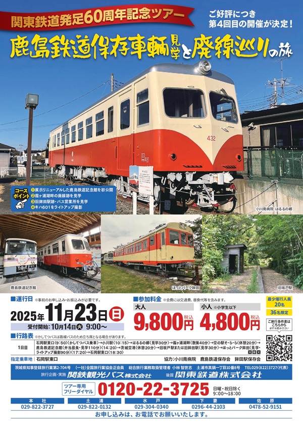 関東鉄道グループの関鉄観光では、鹿島鉄道保存会、鉾田駅保存会などの協力の下、「鹿島鉄道保存車両見学と廃線巡りの旅」の4回目のツアーを2025年11月23日(日)に催行する。