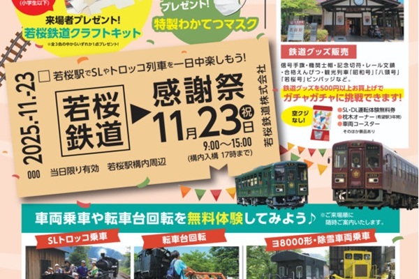 若桜鉄道では、2025年11月23日(日)に若桜鉄道感謝祭を開催する。当日は若桜鉄道駅の構内への入構が終日無料になるほか、様々なアクティビティが用意される。大人気のSLトロッコ乗車体験やSL運転室乗車体験、ヨ8000形・除雪車両乗車体験などの実車への乗車体験にくわえ、転車台回転体験や犬クギ打ち体験といった催し物も行われる予定。