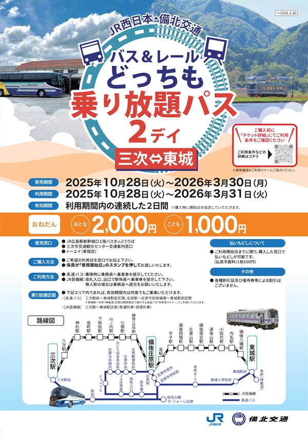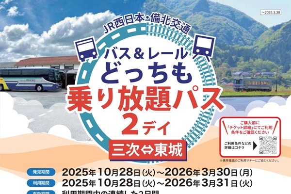JR西日本と備北交通株式会社は、芸備線と備北エリアの高速バスが2日間乗り降り自由の企画乗車券を再発売する。設定区間はJR芸備線の三次駅~東城駅間、高速バスの三次駅前~東城駅前・帝釈(神龍湖)、庄原駅~庄原市街地循環~東城駅前の区間。