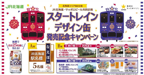また、本商品の発売にあわせ「サッポロ クラシック スタートレインデザイン缶発売記念キャンペーン」を実施する。対象商品1,000 円以上(税込)を購入すると抽選で、実際にJR北海道の駅で使われていた「駅名標」や、「赤い星」や「青い星」の各沿線にゆかりのある観光列車のペア乗車券とグルメのセットが当たる。詳しくはキャンペーンサイトを参照のこと。