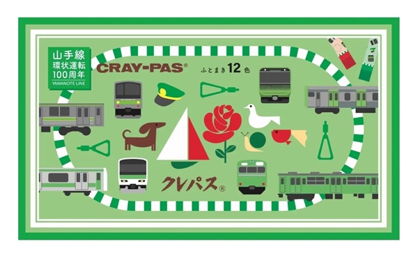 山手線×クレパス® 100周年記念コラボ商品。山手線環状運転100周年と、クレパスⓇの販売100周年を記念しての特別コラボで、おなじみのクレパス®のデザインに、山手線のモチーフをあしらった限定仕様。箱や巻紙に山手線の車両や路線をイメージしたイラストが描かれた、鉄道ファンも文具ファンも見逃せないアイテム。