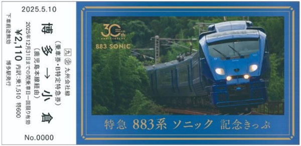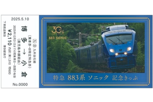 JR九州では、特急「ソニック」で運行されている883系のデビュー30周年を記念して、記念ステッカー・缶バッジ付きの記念乗車券を発売する。