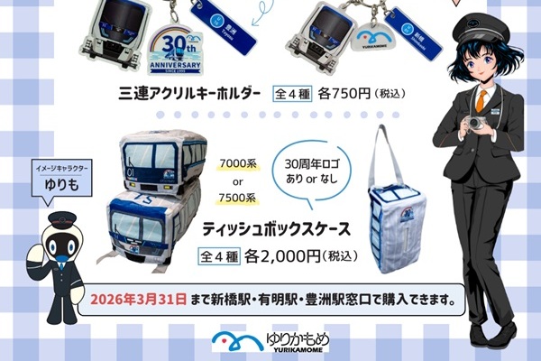 ゆりかもめは、開業30周年を記念して、特別な記念グッズを発売する。記念グッズは、7300系電車型目覚まし時計(税込2,000円)や再生PETエコバック(税込1,000円)、三連アクリルキーホルダー(税込750円)など全13種類で、どれもこの期間だけの限定アイテムとなっている。