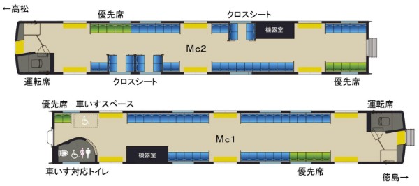 ▲図上のMc2が高松方でトイレ無し、その代わりにセミクロスシートとなっています。図下のMc1は徳島方で車いす対応トイレと車いすスペースを持ち、一般席はすべてロングシートとなっています。両車両ともに機器室が車内にあることにも注目で、この部分は側窓がありません。(プレスリリースより)