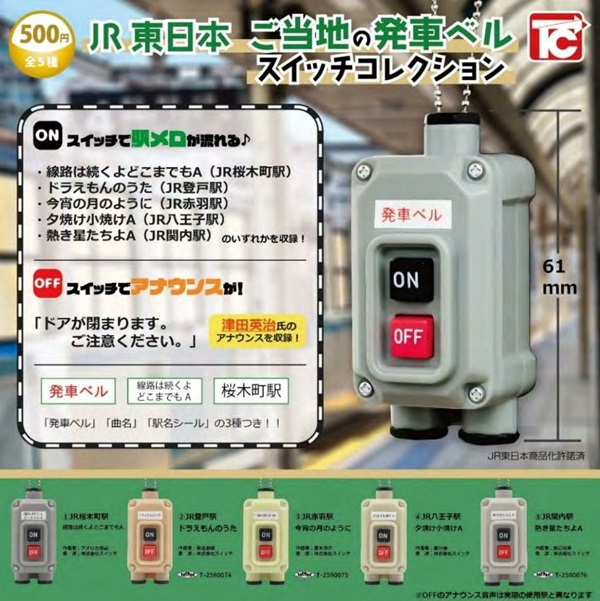 電車の出発を知らせる「発車ベルスイッチ」の玩具で、ONボタンを押すと、JR東日本のご当地の発車メロディが流れ、OFFボタンを押すと、JR東日本で長年、駅の自動放送を担当されていた津田英治氏による「ドアが閉まります。ご注意ください」というアナウンスが再生される。