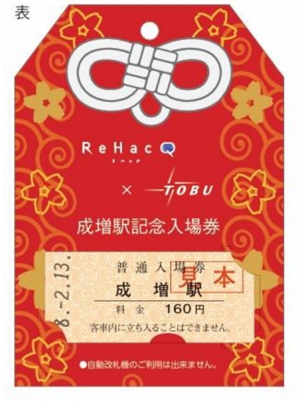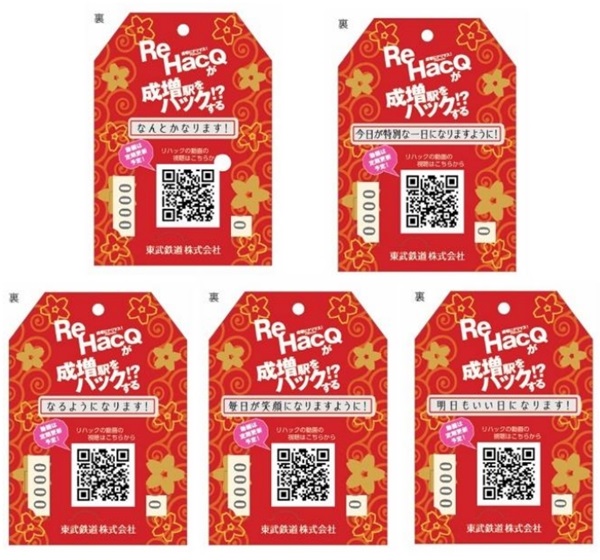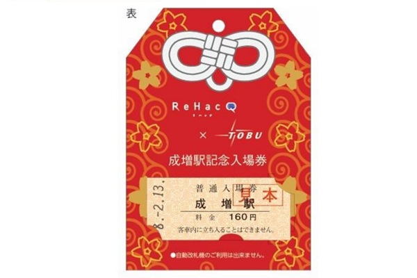 今回発売される「ReHacQ×東武鉄道 記念入場券」は、5種類の「成増」にちなんだラッキーワードが記載されたお守り型の台紙に、成増駅の入場券がセットされている。