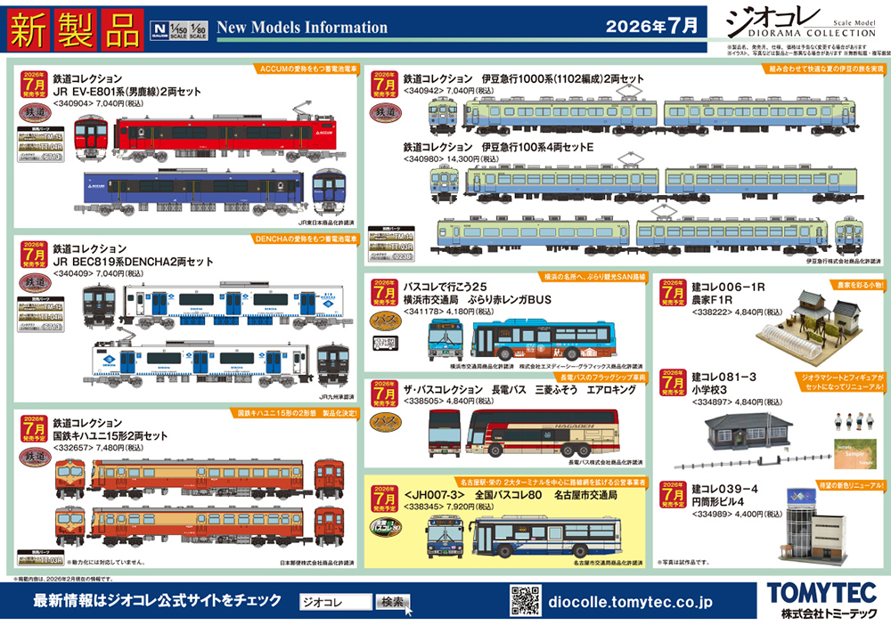 そのほかにも男鹿線EV-E801系、BEC819系DENCHA、キハユニ15、伊豆急行1000系(1102編成)、伊豆急行100系4両セットE、バスコレクションシリーズから長電バス三菱ふそうエアロキング、バスコレで行こうシリーズからは横浜市交通局ぶらり赤レンガBUS、全国バスコレ80シリーズからは名古屋市交通局、また建物コレクションから農家F1R、小学校3、円筒形ビル4が新登場する。