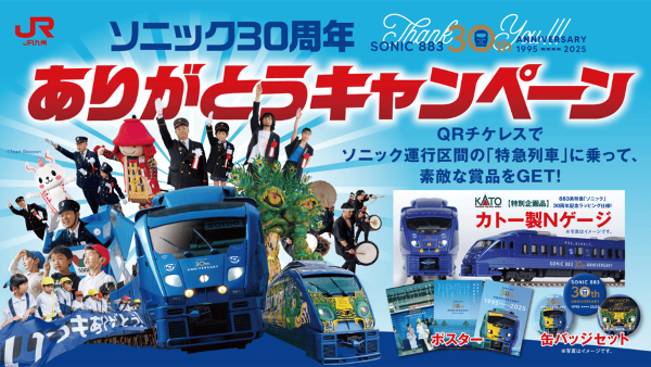 JR九州大分支社は、「883系ソニック」運行開始30周年のフィナーレ企画として、利用客への感謝の気持ちと、これからも特急「ソニック」が地域の皆さまに愛される列車となるよう、思いをこめ、「特急列車(ソニック運行区間)」乗車キャンペーンを実施する。