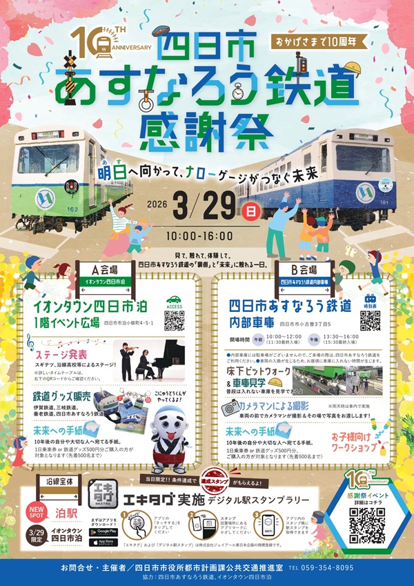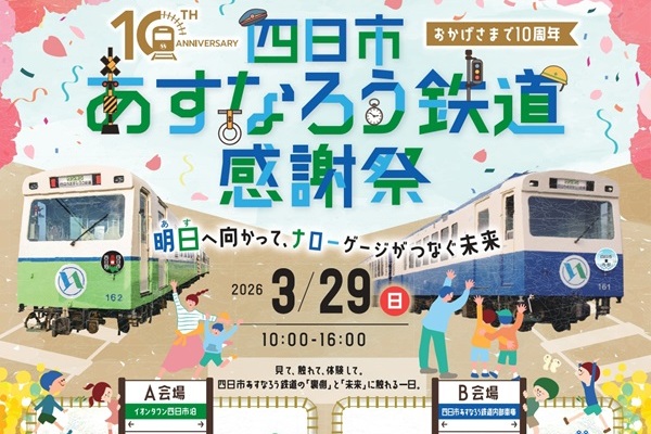 四日市あすなろう鉄道は、2025年4月1日をもって開業10周年を迎えたことを記念して、2026年3月29日(日)、四日市あすなろう鉄道感謝祭を開催する。