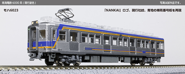 KATOより、2026年3月発表の試作品画像が到着した。今回南海電鉄6000系に現行塗色のカラーバリエーションが新登場した。オリジナルの無塗装状態から、「NANKAI」ロゴや現行社紋、青地の車両番号板のほか、青とオレンジの帯が巻かれた現在の姿としている。