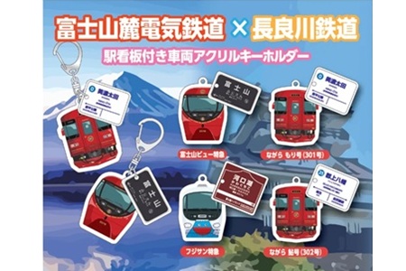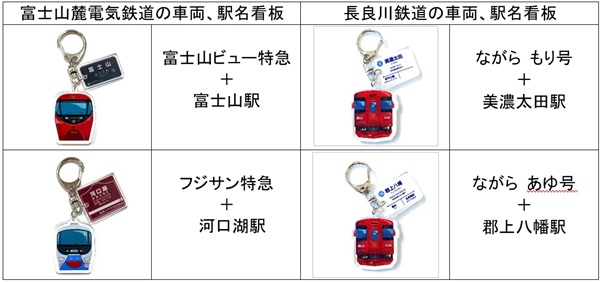 長鉄では水と踊りの城下町・郡上八幡、麓鉄では世界文化遺産の富士山と、両路線の沿線には全国的にも知名度の高い観光地があり、「列車に乗ること自体が旅の目的となる観光」を共通の価値として提供している。その両者が共同で企画制作したカプセルトイは、観光列車の車両アクリルキーホルダーに、始発駅または観光地最寄り駅の駅名看板を組み合わせたデザイン(長鉄・麓鉄各2種類販売)で、旅先の駅で素敵な旅の記憶とともに持ち帰ることができるお土産グッズとなっている。