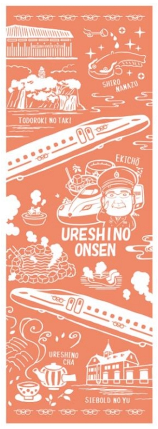 今回は、これまでの横型から縦型デザインを初めて採用し、西九州新幹線「かもめ」や嬉野温泉駅駅舎、嬉野温泉駅長のほか、嬉野温泉のシンボルである、美肌のご利益があるといわれる豊玉姫神社の白なまず様など、嬉野温泉らしさをふんだんに盛り込んだデザインの手ぬぐい。さらに、嬉野温泉公衆浴場「シーボルトの湯」をイメージしたオレンジ色を採用し、温泉地ならではのあたたかみを感じられる仕上がりで、嬉野温泉駅でしか手に入らない特別な手ぬぐいとなっている。
