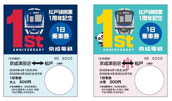 京成電鉄は、2026年4月1日(水)に松戸線の開業1周年を迎えることを記念して、「松戸線開業1周年記念1日乗車券」の発売および、記念ヘッドマークを掲出した車両を運行する。