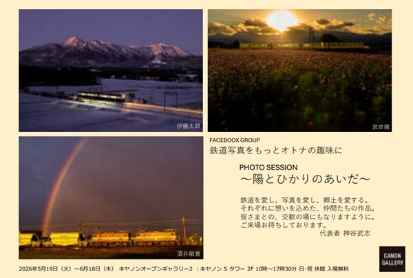 鉄道写真コミュニティ「鉄道写真をもっとオトナの趣味に」は、2026年5月19日(火)より東京・港区のキヤノンオープンギャラリー2にて、写真展 「PHOTO SESSION ~陽とひかりのあいだ~」 を開催します。