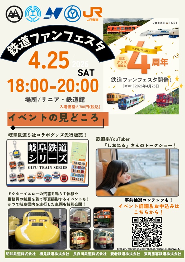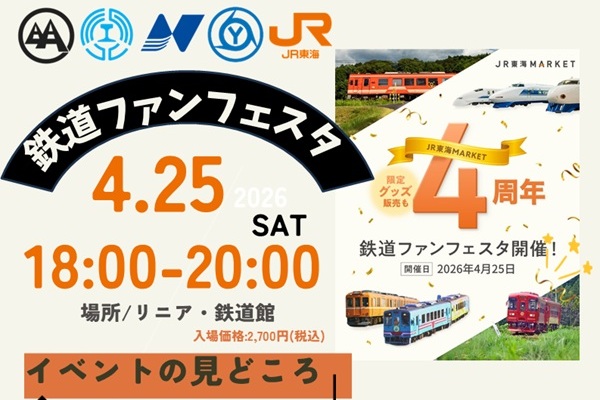 JR東海は、JR東海MARKET開設4周年を記念し、岐阜県内鉄道事業者の明知鉄道、樽見鉄道、長良川鉄道、養老鉄道と連携して、2026年4月25日(土)にリニア・鉄道館でレイル・ファンを対象にしたリアルイベント「鉄道ファンフェスタ」を開催する。