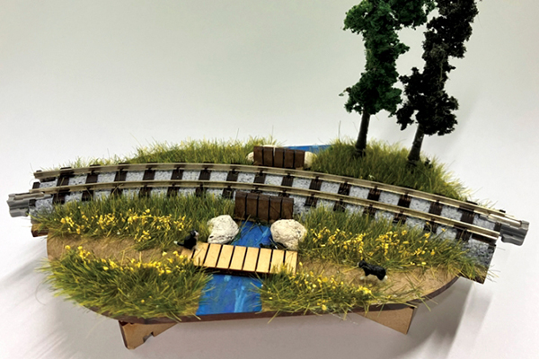 Nゲージが走行可能なジオラマを作ります。制作した後、ジオラマをつないで電車を走らせます。