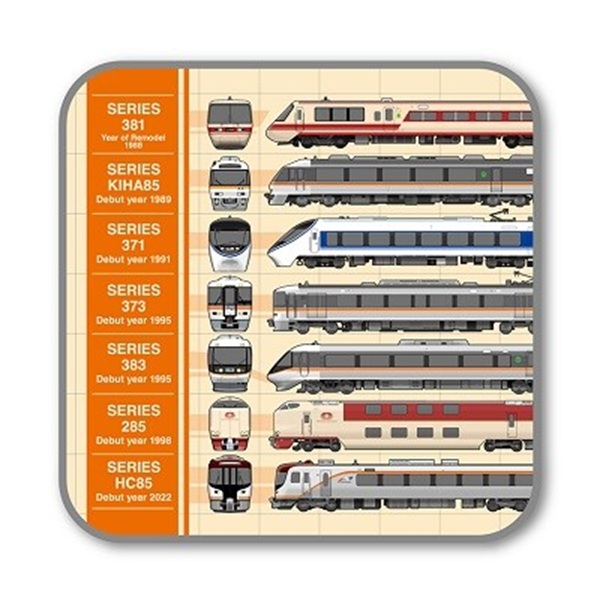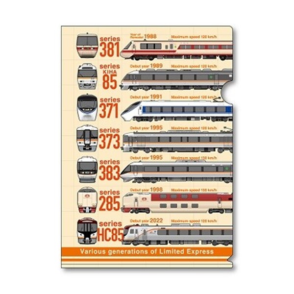 同商品では、381系から最新のHC85系まで、JR東海の特急シーンを彩ってきた全7形式の歴代車両がひとつのデザインに集結。カーブを駆け抜ける振り子式車両、各地を結んできた電車特急、長距離の旅を支えた寝台特急、そして次世代へとつながるハイブリッド車両など、多様な進化を遂げてきたJR東海特急の歩みとその系譜を、日常使いしやすいクリアファイルとタオルハンカチに凝縮している。