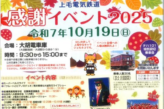 上毛電気鉄道では、10月19日(土)に「感謝イベント2025」と題して楽しいイベントを開催します。■開催日時:2025年10月19日(日) 9:30~15:00 ■場所:大胡電車…