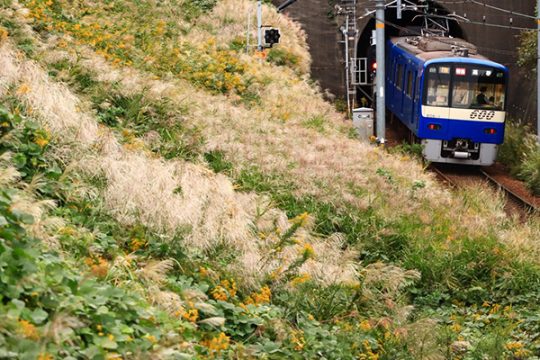 ●秋深まりし京急沿線。ススキに見送られ一路、東へ向かうブルースカイトレイン。2025.10.21 京浜急行電鉄 久里浜線 津久井浜〜京急長沢 P:森本裕之●一面に咲くそばの花を横目…