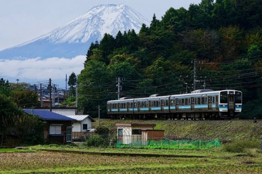 ●富士山の初冠雪が観測されたと発表。冠雪した富士山が綺麗に映えて、直通電車211系が急勾配を下ってやって来ました。2025.10.23 富士山麓電気鉄道 大月線 寿〜三つ峠 P:巻…