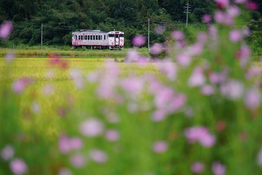 ●もころんづくし。2025.09.28 小田急電鉄 小田原線 読売ランド前~百合ヶ丘 P:中村 敦●さわやかな秋風そよぐ花畑のなかを、朱い気動車がトコトコと駆け抜けてゆきました…。…