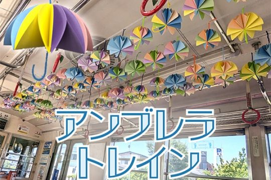 車内のイメージ。カラフルな傘がびっしりと飾り付けされている。(画像:弘南鉄道ホームページより) 弘南鉄道では、2025年6月1日(日)~6月25日(水)に「アンブレラトレイン」を大…