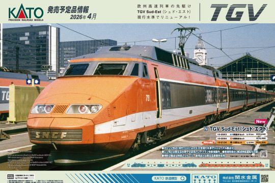 KATOから新製品情報が発表された。今回は欧州における高速列車の先駆けとなったフランス国鉄のTGVのうち、初期のオレンジ色のカラーリングを纏った「TGV Sud-Est」が現行水…