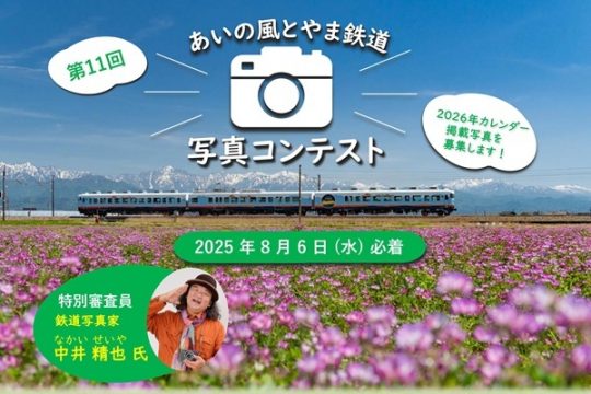 あいの風とやま鉄道では、同社の車両や駅舎、沿線風景などをテーマとした「第11回 あいの風とやま鉄道写真コンテスト」を開催する。応募作品は富山駅等に展示及びカレンダーに掲載される予…