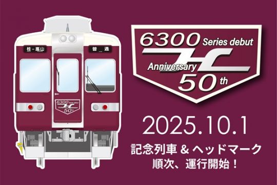 阪急電鉄は、6300系車両のデビュー50周年を記念して、嵐山線で運行中の6300系全列車にヘッドマークを掲出する。また、C#6352編成を記念列車に選定し、各車両の車内妻面に記念…