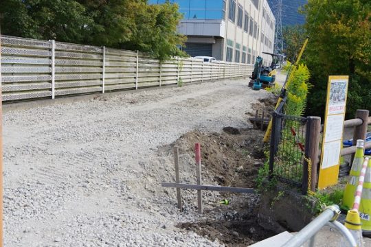 宮島昌之過去に生活道路拡幅で部分撤去した箇所から旧中鶴来・旧加賀一の宮方を見る。「公立つるぎ病院」の横に接していた廃線跡は、工事で姿が消え綺麗な砂利が敷かれていた。市道「鶴来金剱線…