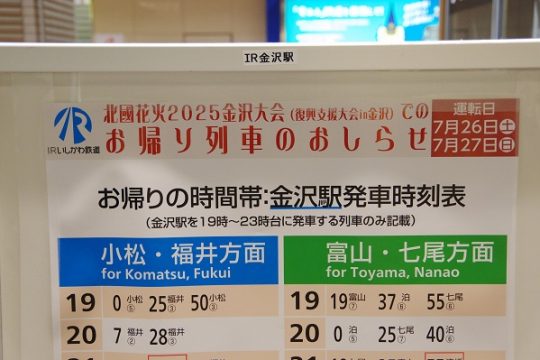 宮島昌之「北國花火2025金沢大会」の帰りに便利な列車を告知するポスター。なんの変哲もない告知のように見える。告知ポスターのタイトルに秘密がある。SNSでも発信紹介され、反響も多か…