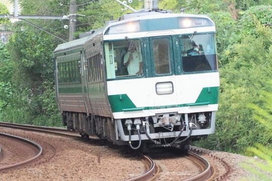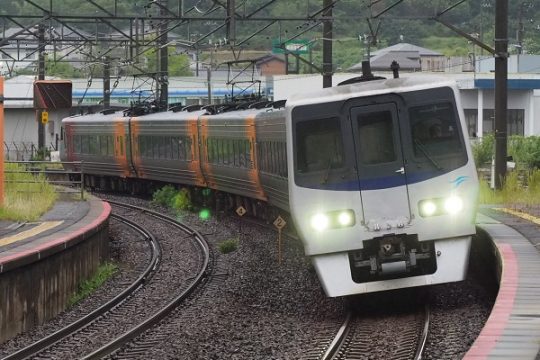 植松 繁曲線を車体を軽快に傾けて駆けていったいしづち103号。'25.9.12 予讃線 国分 所定では松山運転所所属8600系特急型電車モノクラス4両で運転される特急「いしづち10…