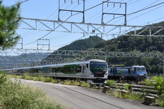 尾名高大蔵「あずさ83号」(左)と、EH200-8号機のハンドル訓練。'25.8.30 中央本線 塩尻 2025年8月30日、E257系5000番代OM91編成の「あずさ83号」が…