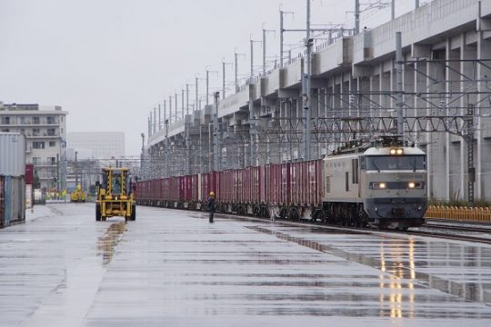 宮島昌之係員や荷役作業のフォークリフトが待機する南福井駅構内に入線する、EF510-509(銀)牽引の4076列車。係員の解説曰く「仕込んだわけではない」とのことで、これまでの機関…