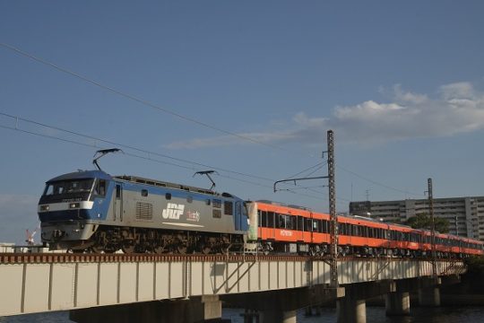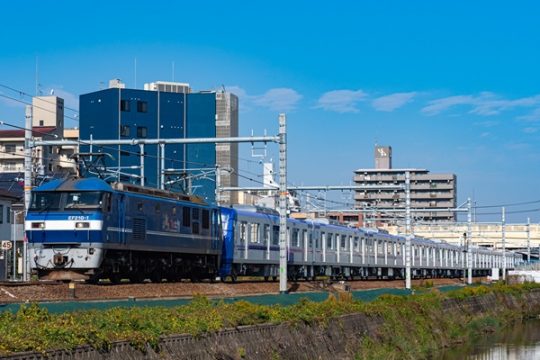 石田哲彦EF210-167号機に牽引され神崎川を渡る伊予鉄道7000系。'25.11.1 片町線(城東貨物北連絡線) 神崎川信号場~吹田貨物ターミナル吹田で方向転換し、伊予鉄道70…