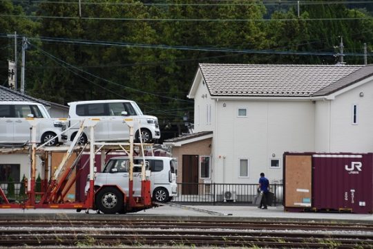 尾名高大蔵20Gコンテナから軽自動車が自走で出てきて、自走でトランスポーターに乗り込んだ。'25.9.13 篠ノ井線 南松本 2025年9月13日、南松本駅で軽自動車の新車がコンテ…