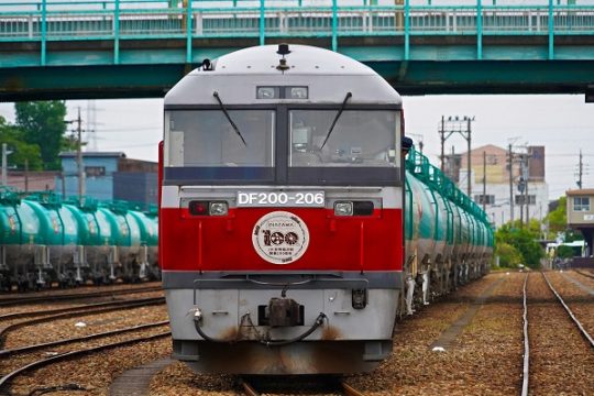 武内克弥JR貨物では、愛知機関区所属のDF200-206に「JR貨物稲沢駅開業100周年」記念ヘッドマークを掲出している。'25.5.24 関西本線(貨物支線) 塩浜(3点共) 2…