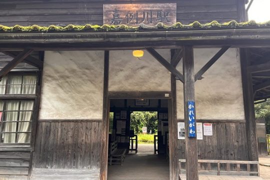 中村年秀駅舎正面に駅名表示が掲示された。 ホームの駅名表示板。貼付されているバス時刻表。'25.9.28 肥薩線 嘉例川(3点共) 豪雨災害で列車のこない嘉例川駅舎に小変化があっ…