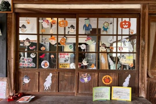 中村年秀駅待合室の飾り。こちらはホーム側。'25.9.29 肥薩線 大隈横川(2点共) 2025年8月の水害の影響で、運休中で列車のこない大隈横川駅だが、地域の利用者によってハロウ…