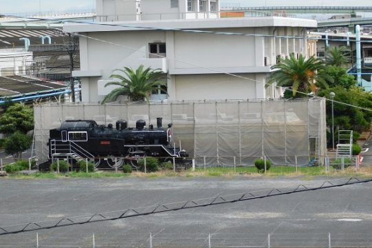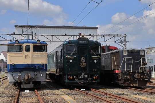 服部ひろみはるばる九州からやってきて、機関車と並ぶ「かわせみ やませみ」(中)。かわせみの美しい紺色が、青空に映える。梅小路運転区で、九州では見られないさまざまな車両・機関車と並ぶ…