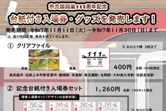 近畿日本鉄道は、奈良線開業111周年を記念して、台紙つき入場券をはじめとした各種記念グッズを発売する。 台紙つき入場券は硬券入場券と台紙のセットで、台紙は発売駅ごとに異なるデザイ…