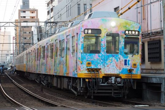 植松 繁子どもたちが描いた絵がラッピングされている。'25.8.21 高松琴平電気鉄道琴平線 片原町 香川県多度津町出身の画家が主宰するアートプロジェクト「絵の具であそぼう」の10…