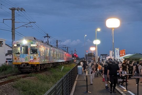 植松 繁バルはエキチカ、傍を電車が走る。'25.9.26 高松琴平電気鉄道琴平線 綾川 2025年9月26日、高松琴平電気鉄道琴平線綾川駅で、綾川町内の飲食店が提供する美味しいおつ…