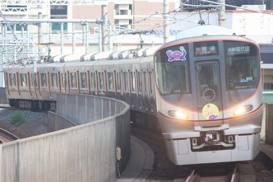 大庭裕和ヘッドマークを掲出した大阪環状線。'25.8.14 大阪環状線 今宮 大阪環状線では、323系LS18編成に「こども隙間転落防止プロジェクト」の公式キャラクター「スキマモリ…