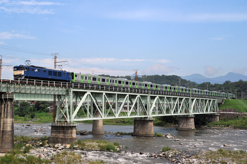 長井竜平(神奈川県)EF64 1031に牽かれて、一路首都圏を目指す。‘18.9.6 上越線 敷島―渋川 9月6日、総合車両製作所新津事業所で落成したE235系トウ25編成が新津~大崎間で配給輸送された。牽引機はEF64 1031であった。 なお、今回の出場配給輸送をもって山手線用のE235系は、製造予定数50編成のうち半分が出揃ったことになる。