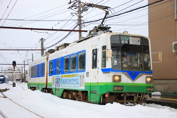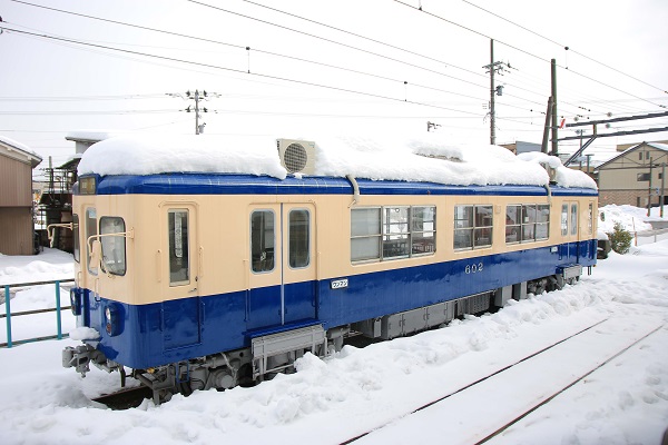 小野慎一郎 今年一番の積雪。右下に緑の融雪装置。‘25.2.11 福井鉄道 北府(2点共) 豪雪地帯では除雪車や融雪装置による除雪が一般的だ。福井鉄道の一部の駅ではホーム上で融雪装置が稼働している。これは、露天となっている乗車場所につき雪の影響を最小限にとどめるとともに、電車内に雪を極力持ち込ませないための装備である。■関連記事◆福井鉄道福武線 880+881編成が除雪車両に転身P:宮島昌之
