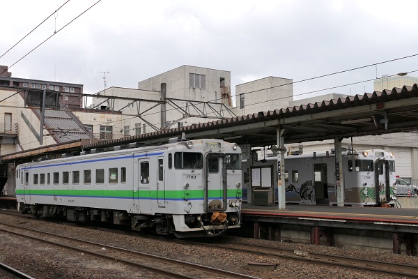室蘭本線追分行き1465Dに充てられ出発を待つキハ40形。写真3枚目奥側のキハ40「カムイサウルス(むかわ竜)復興トレイン」は2025年春で引退することが発表されている。